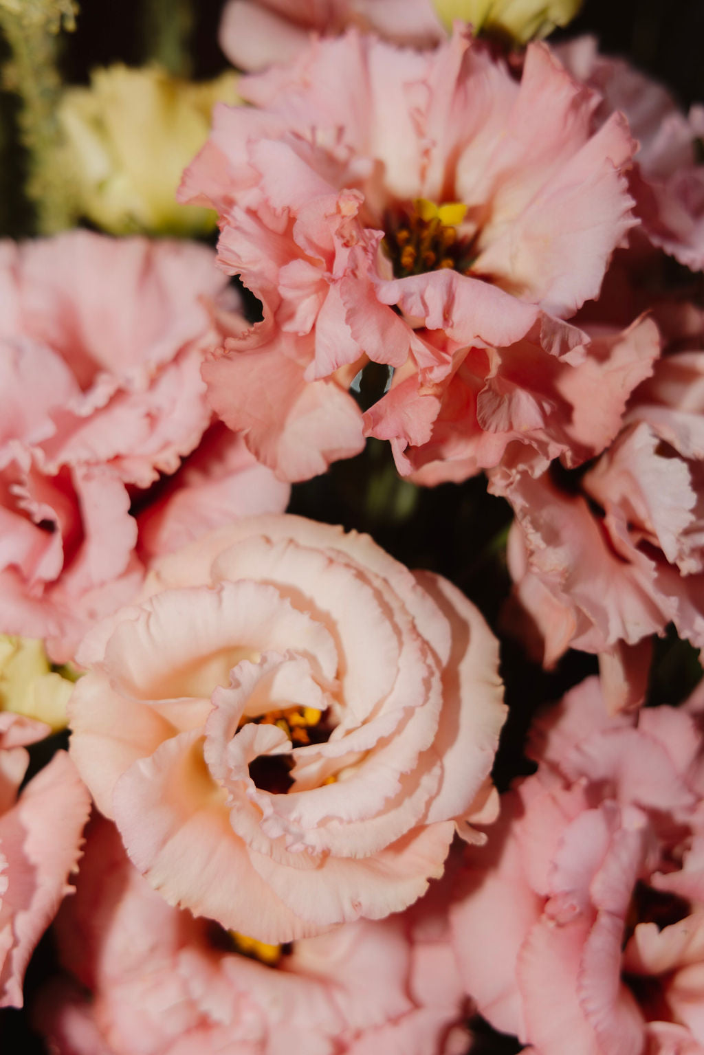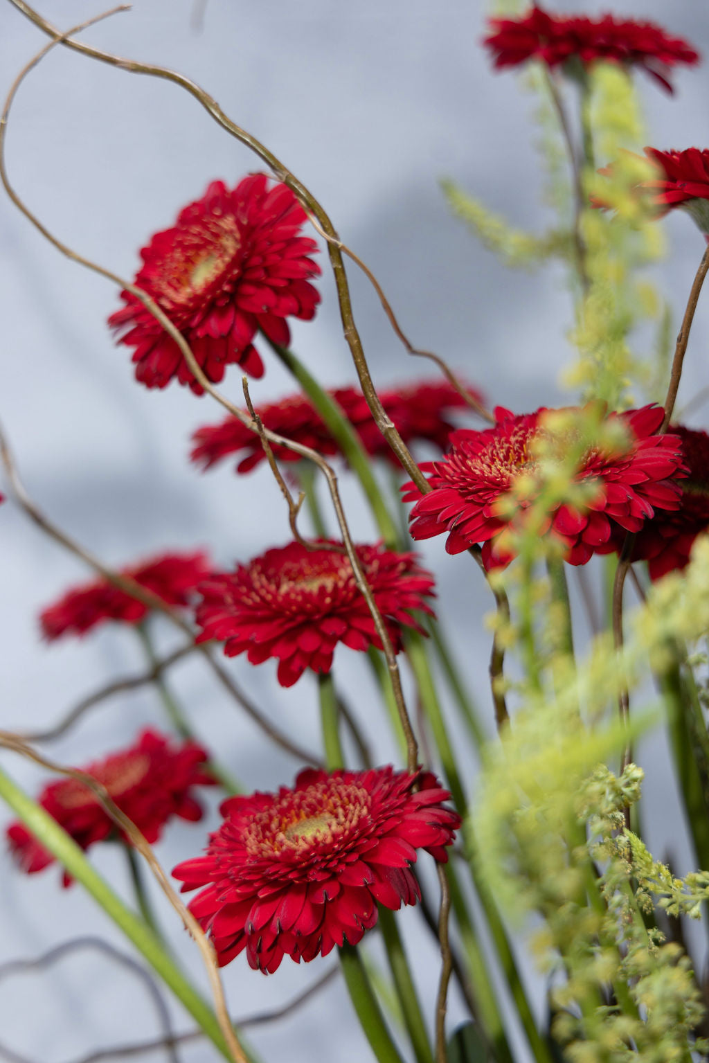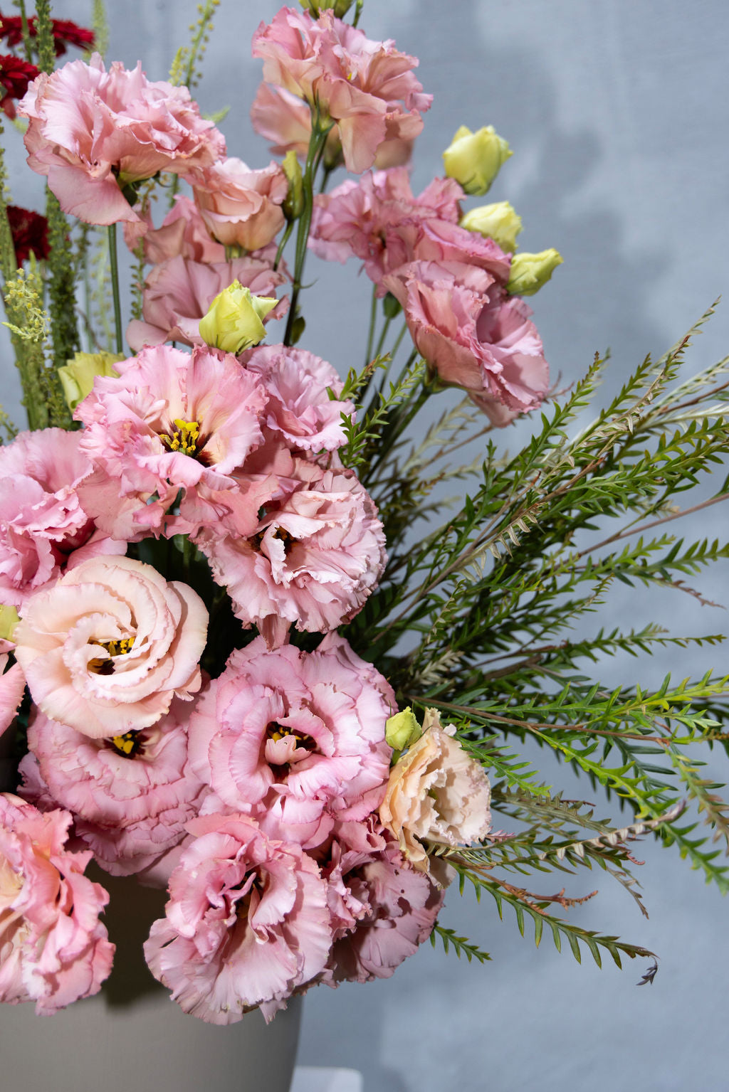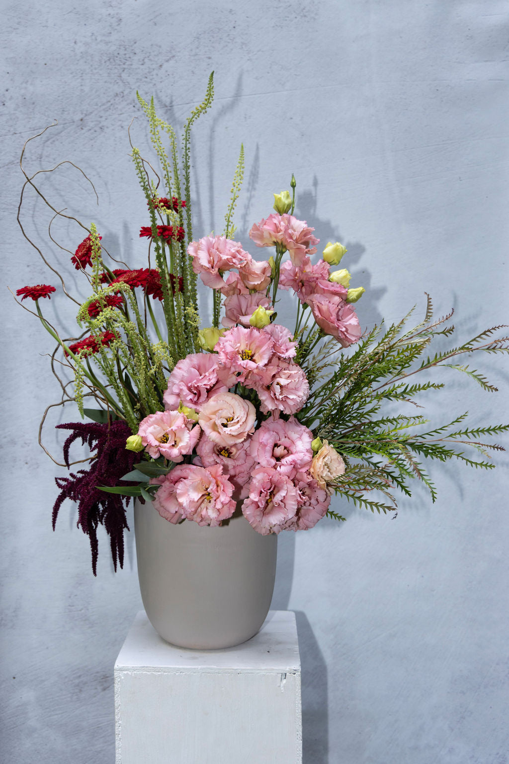 Arreglo sobre base de cerámica beige, mini gerberas, lisianthus, amaranto, pulpo.