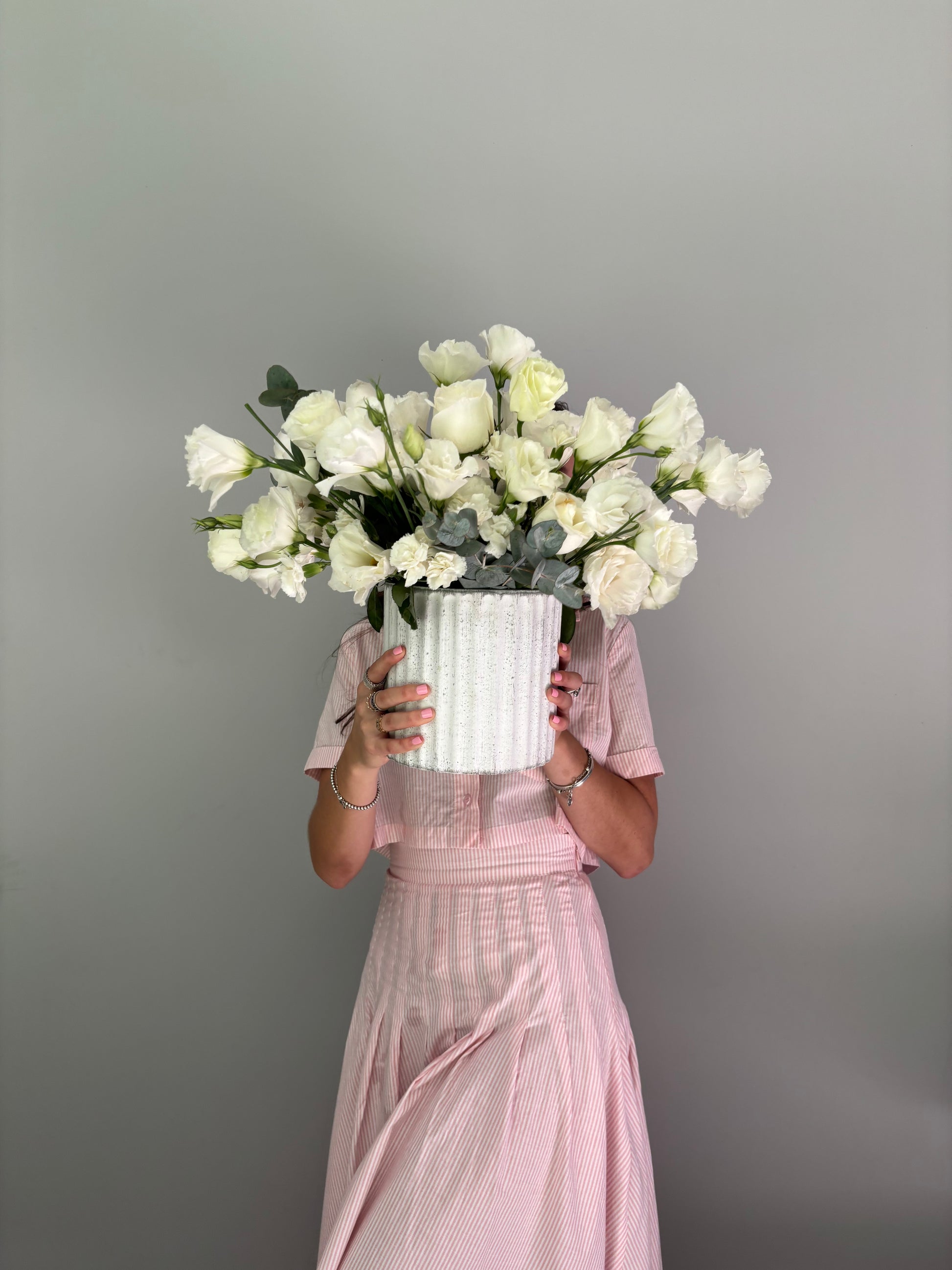 Arreglo con lisianthus, rosas blancas y miller sobre base de cerámica blanca.