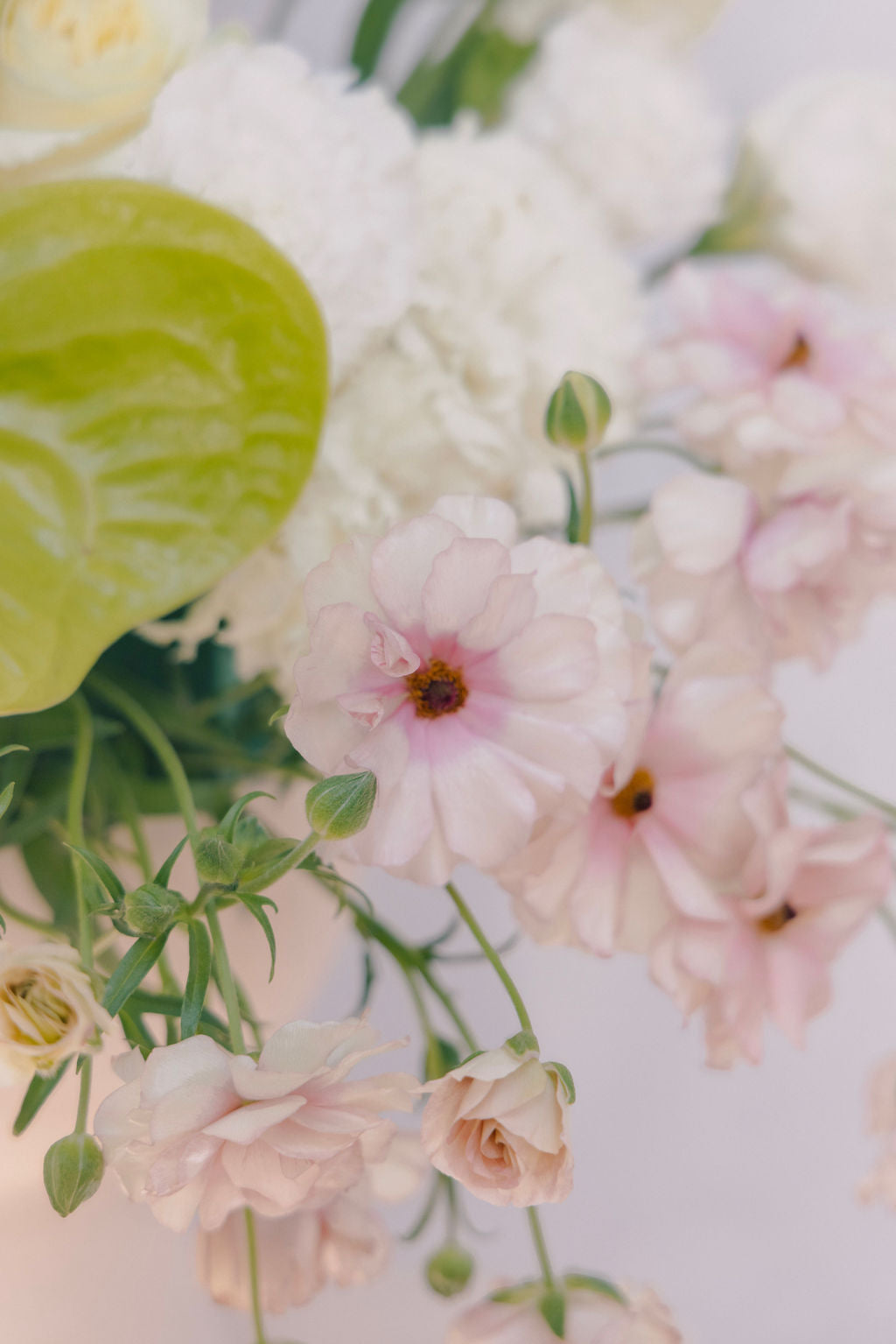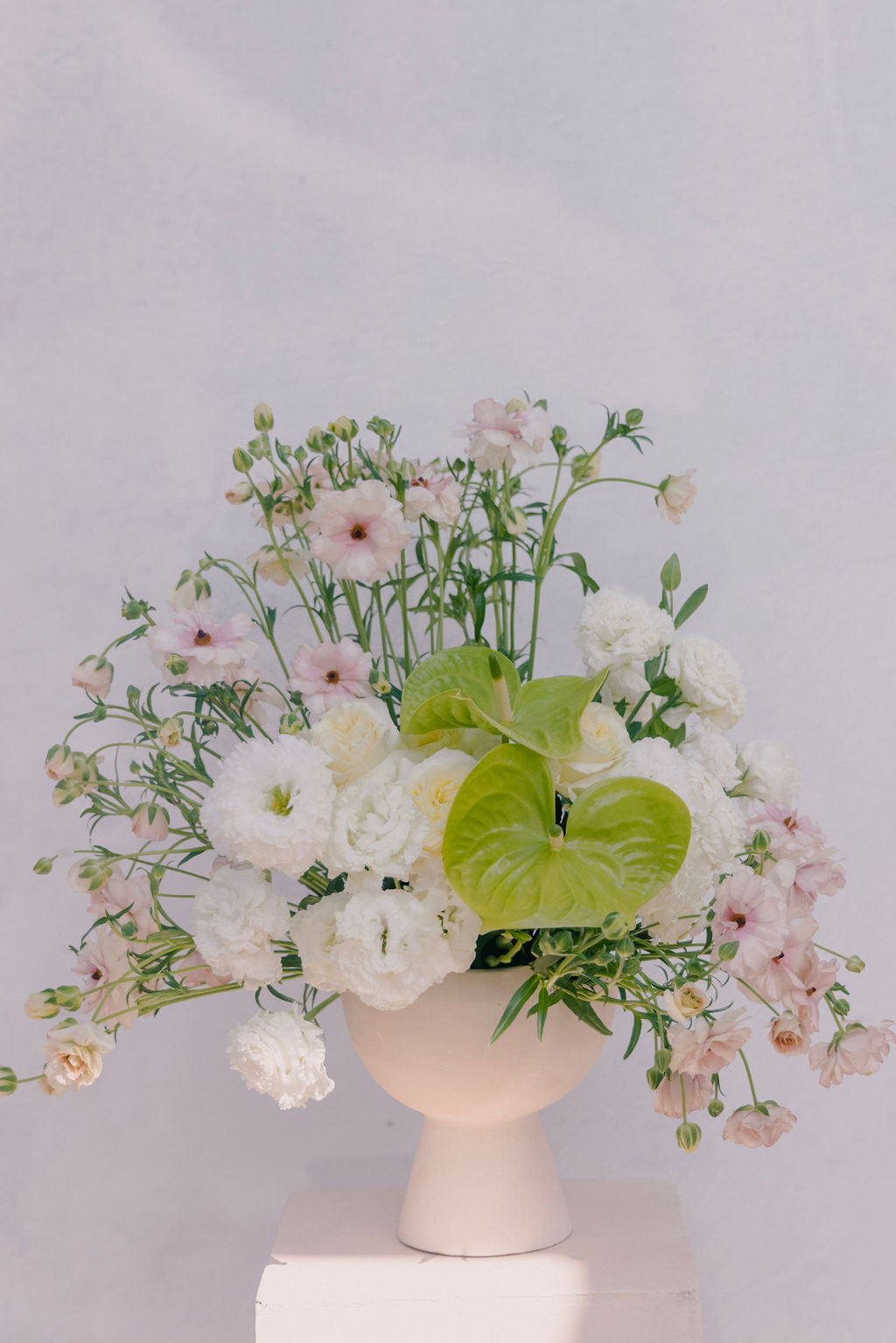 Arreglo con rananculus mariposa, anturios y lisianthus sobre base de cerámica beige.