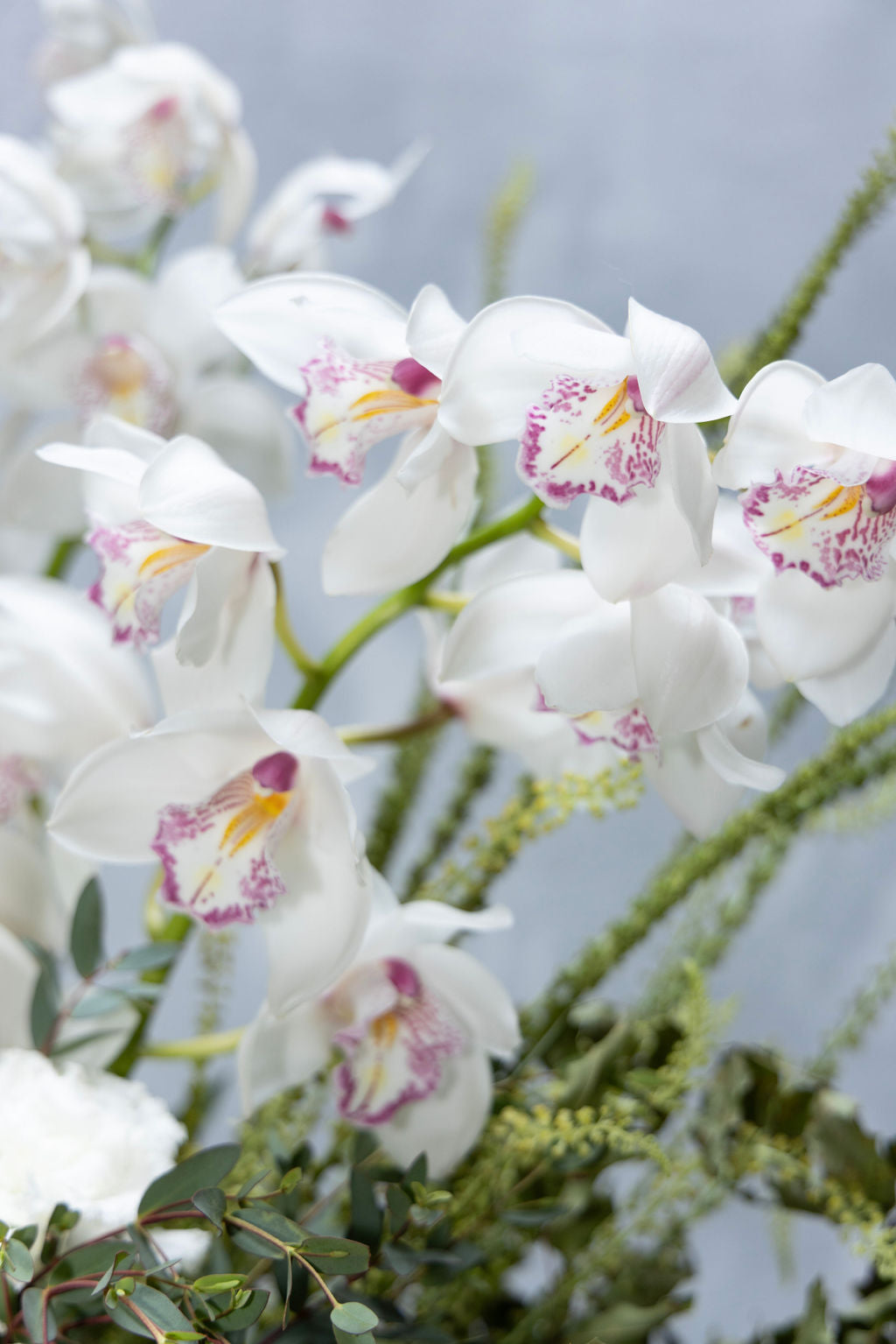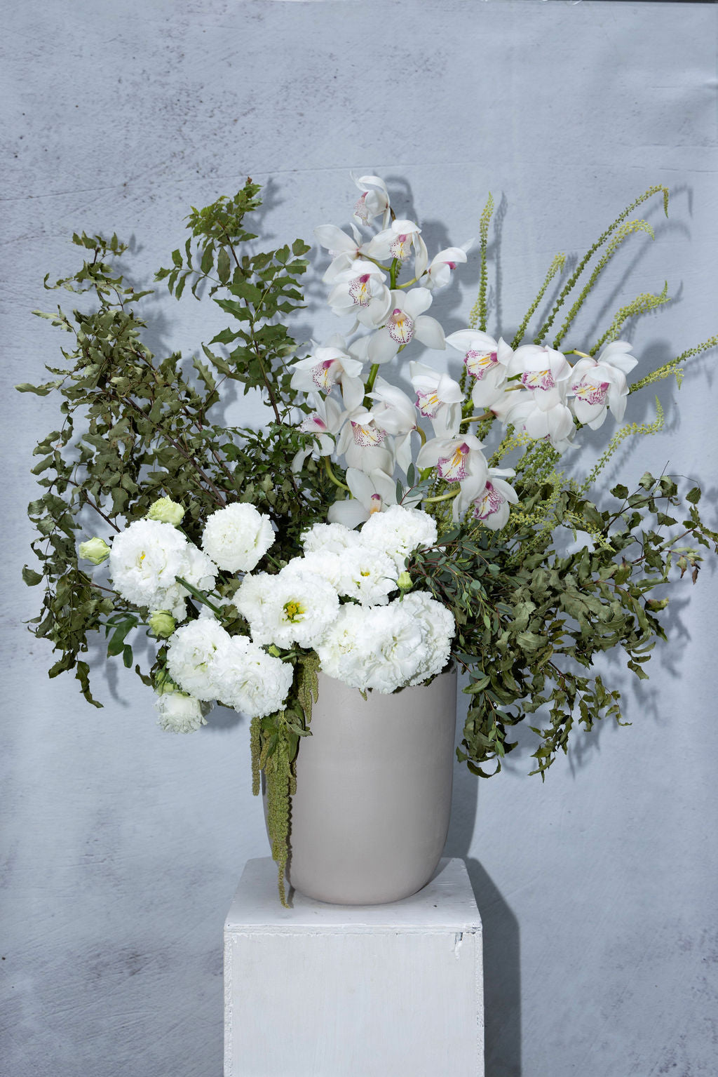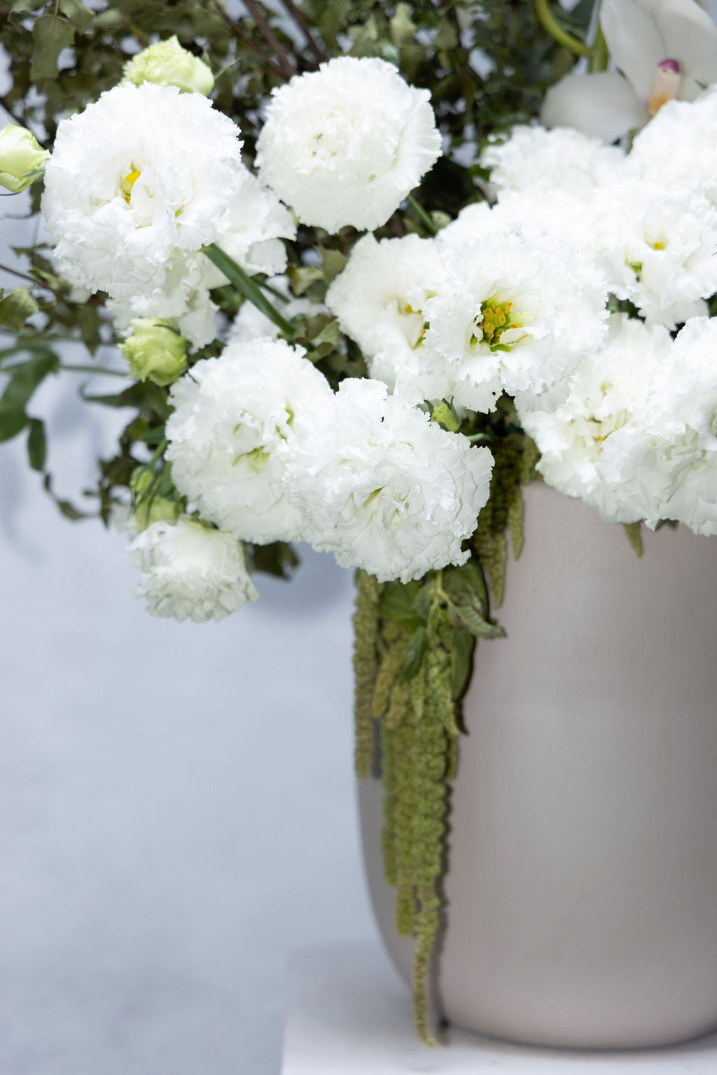 Arreglo sobre base de cerámica beige, lisianthus y orquídeas.