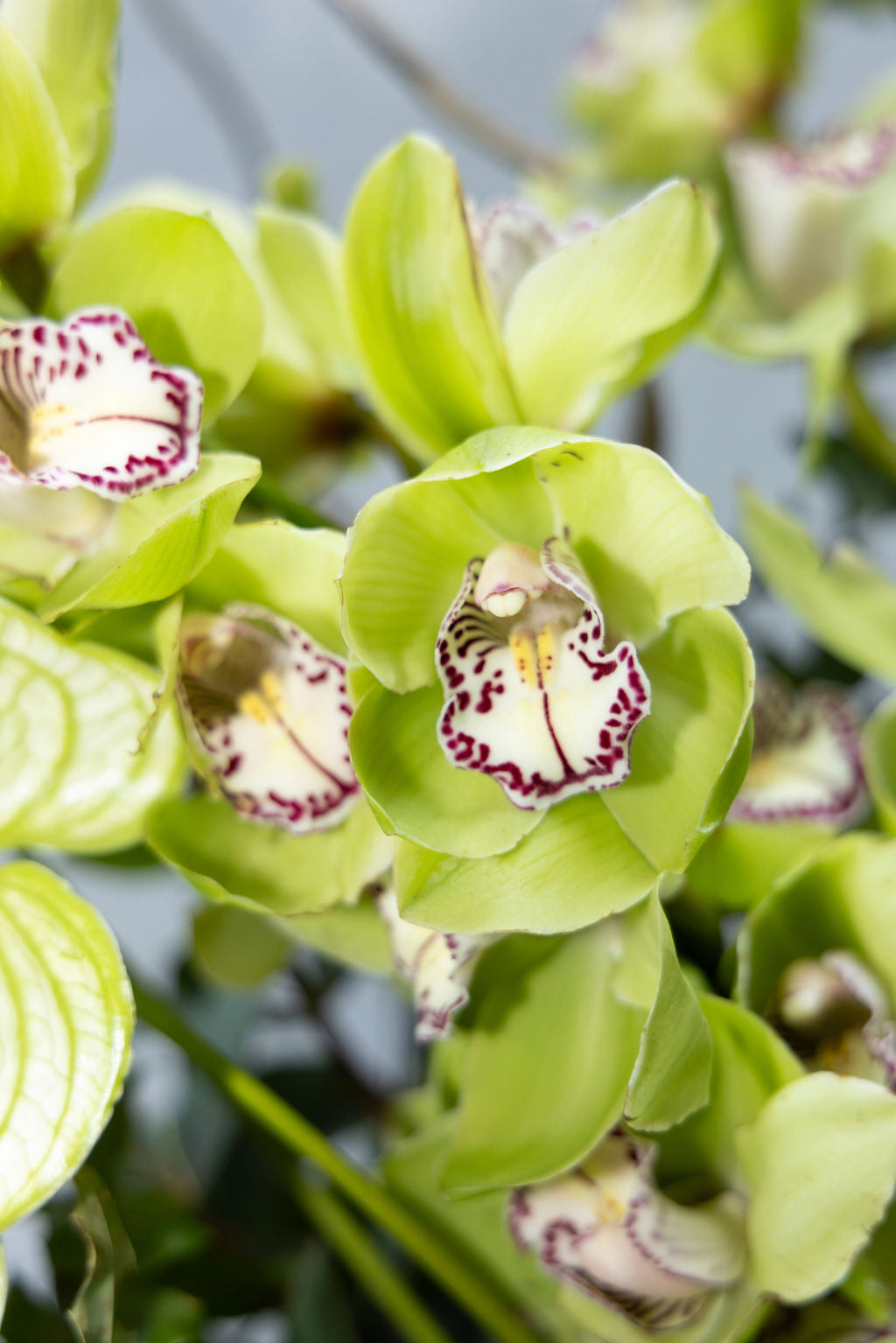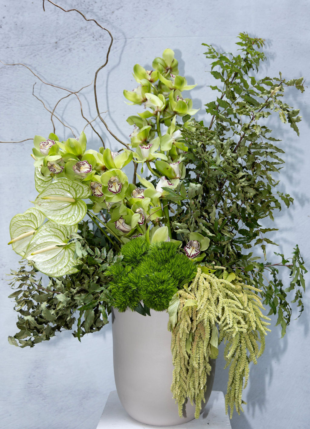 Arreglo sobre base de cerámica beige, lisianthus, orquídeas y anturios.
