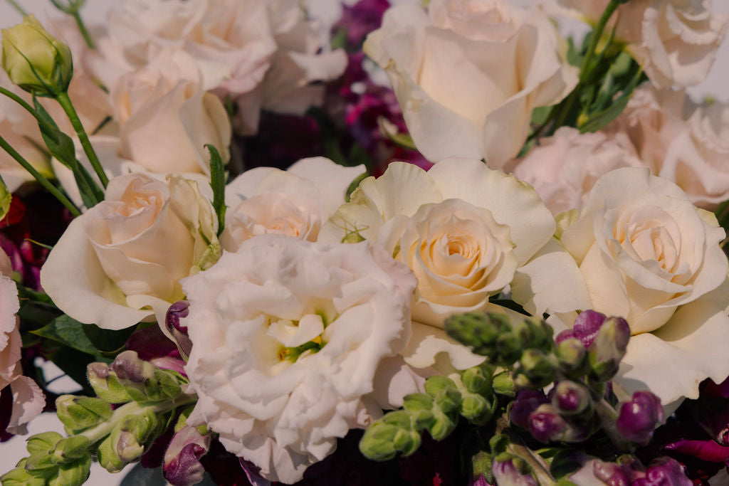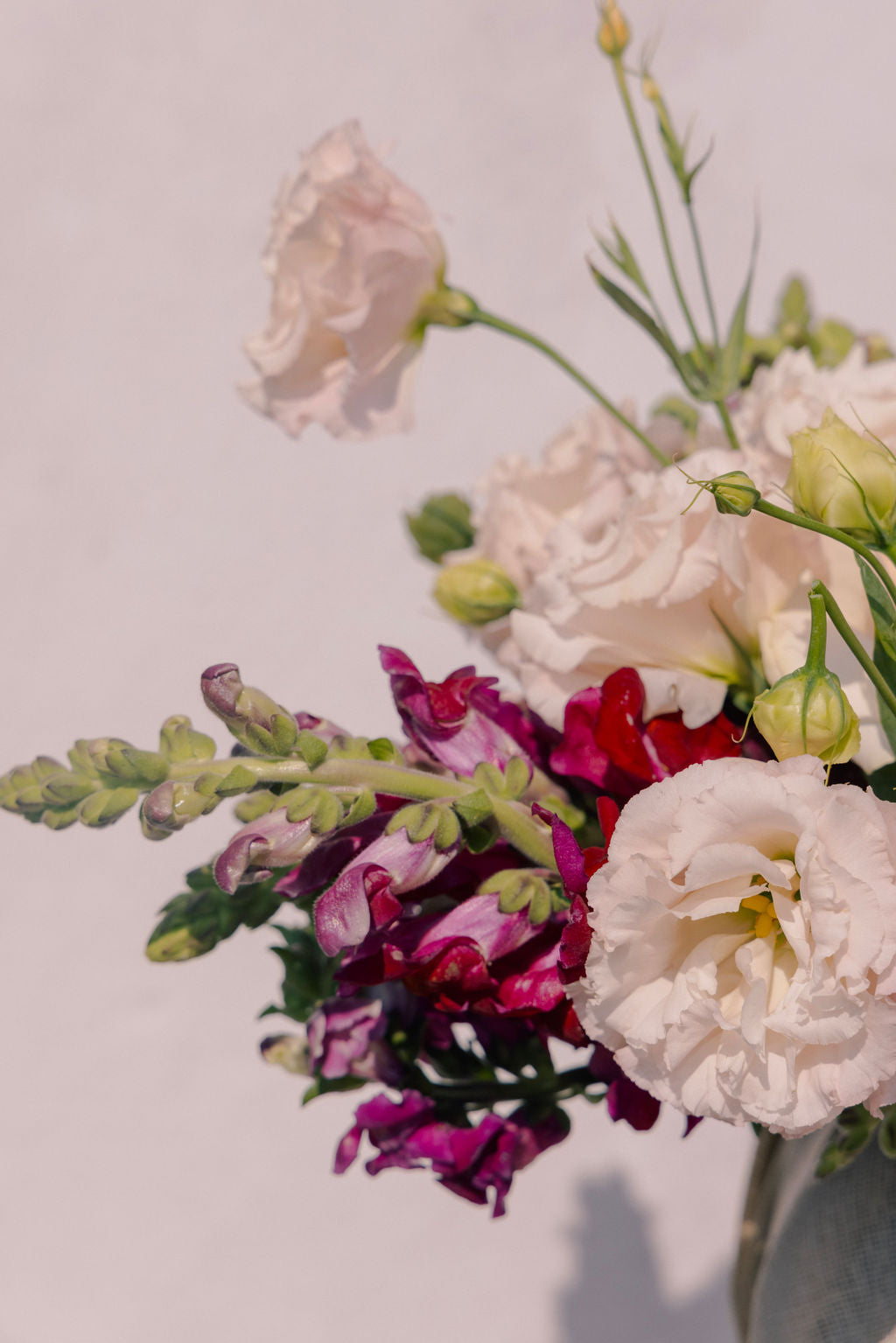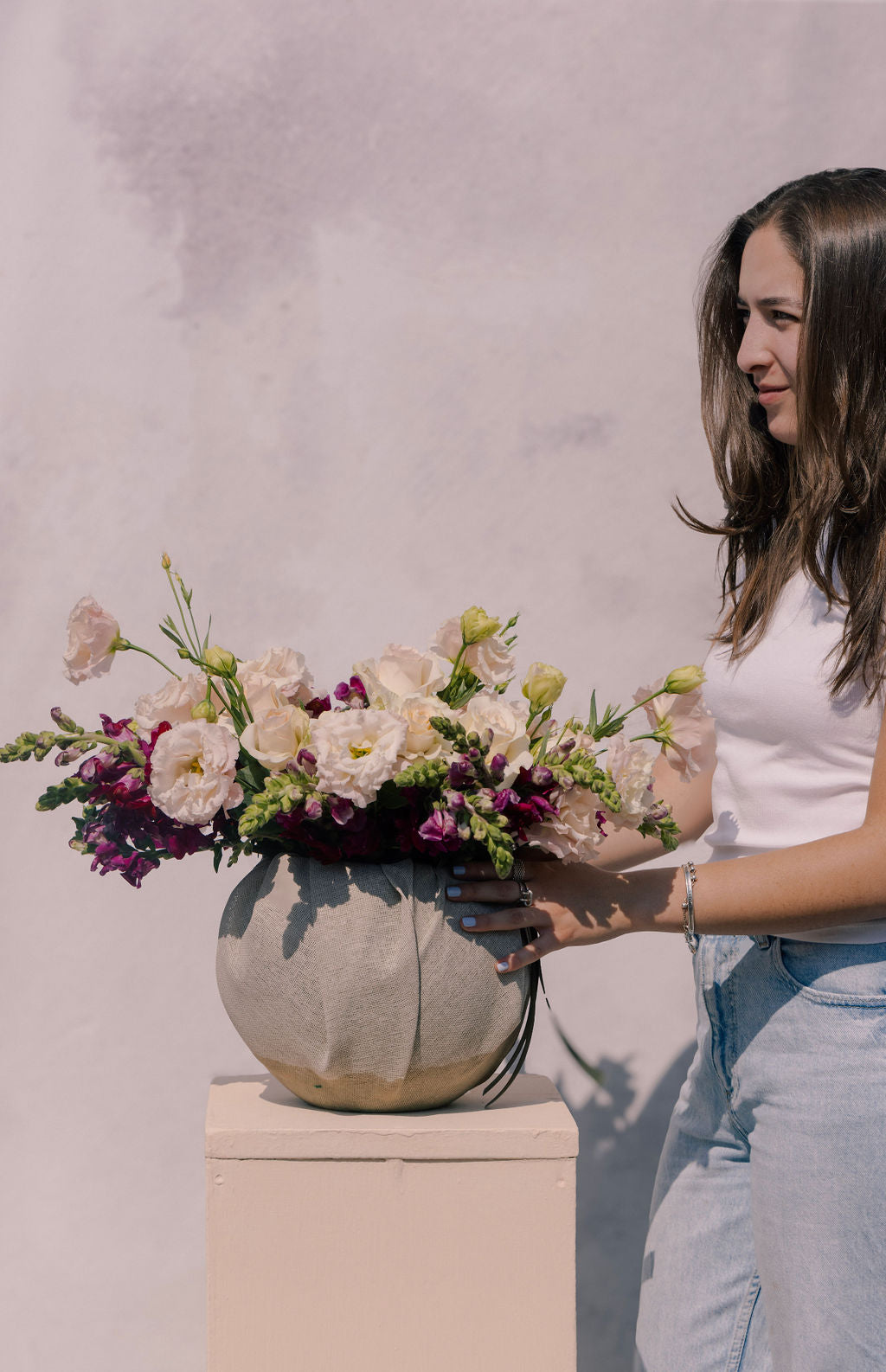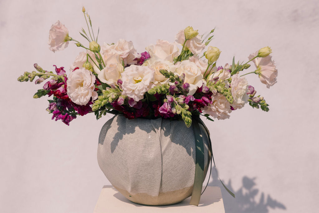 Pecera envuelta en yute con lisianthus, perrito y rosas.