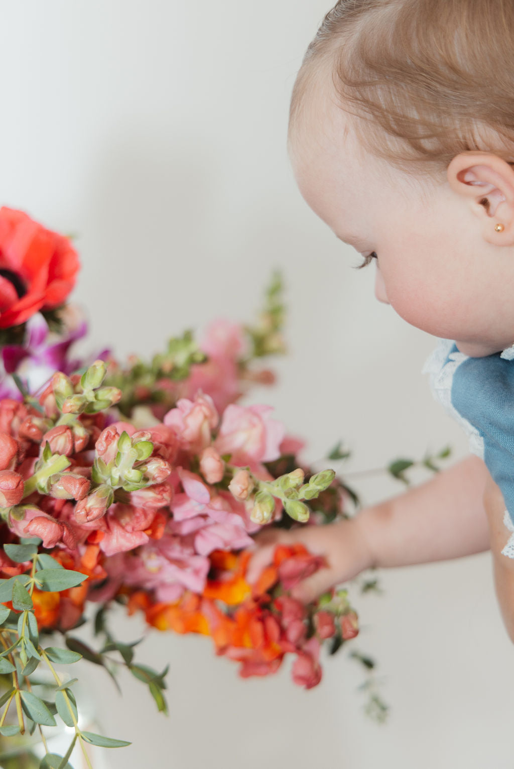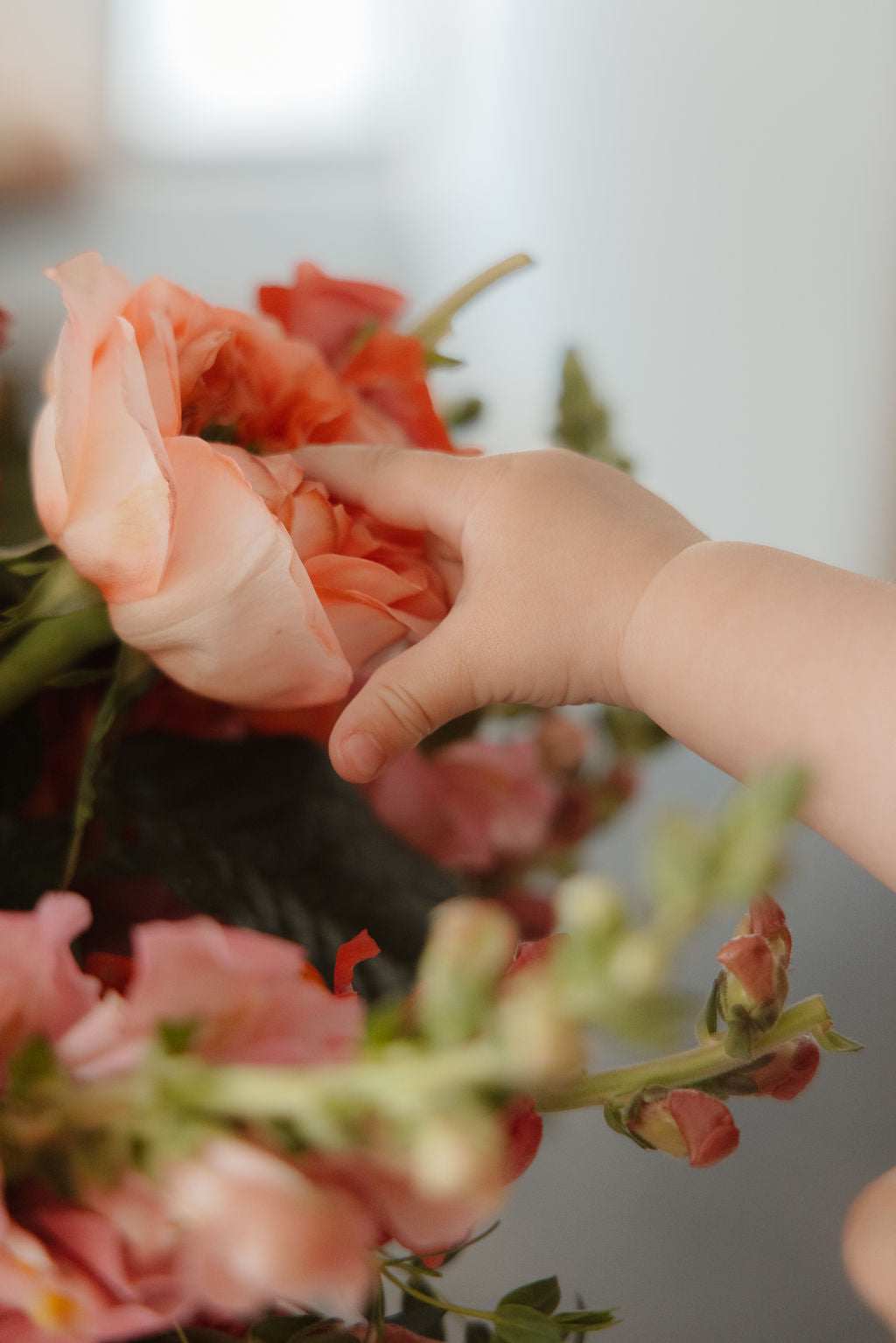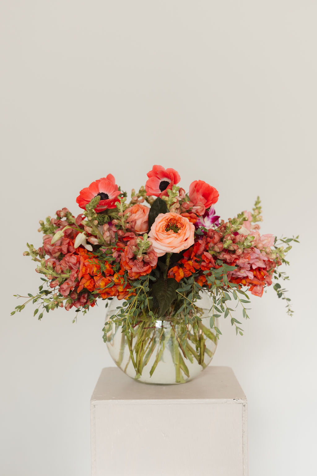 Pecera con perritos, rosas inglesas y anémonas.