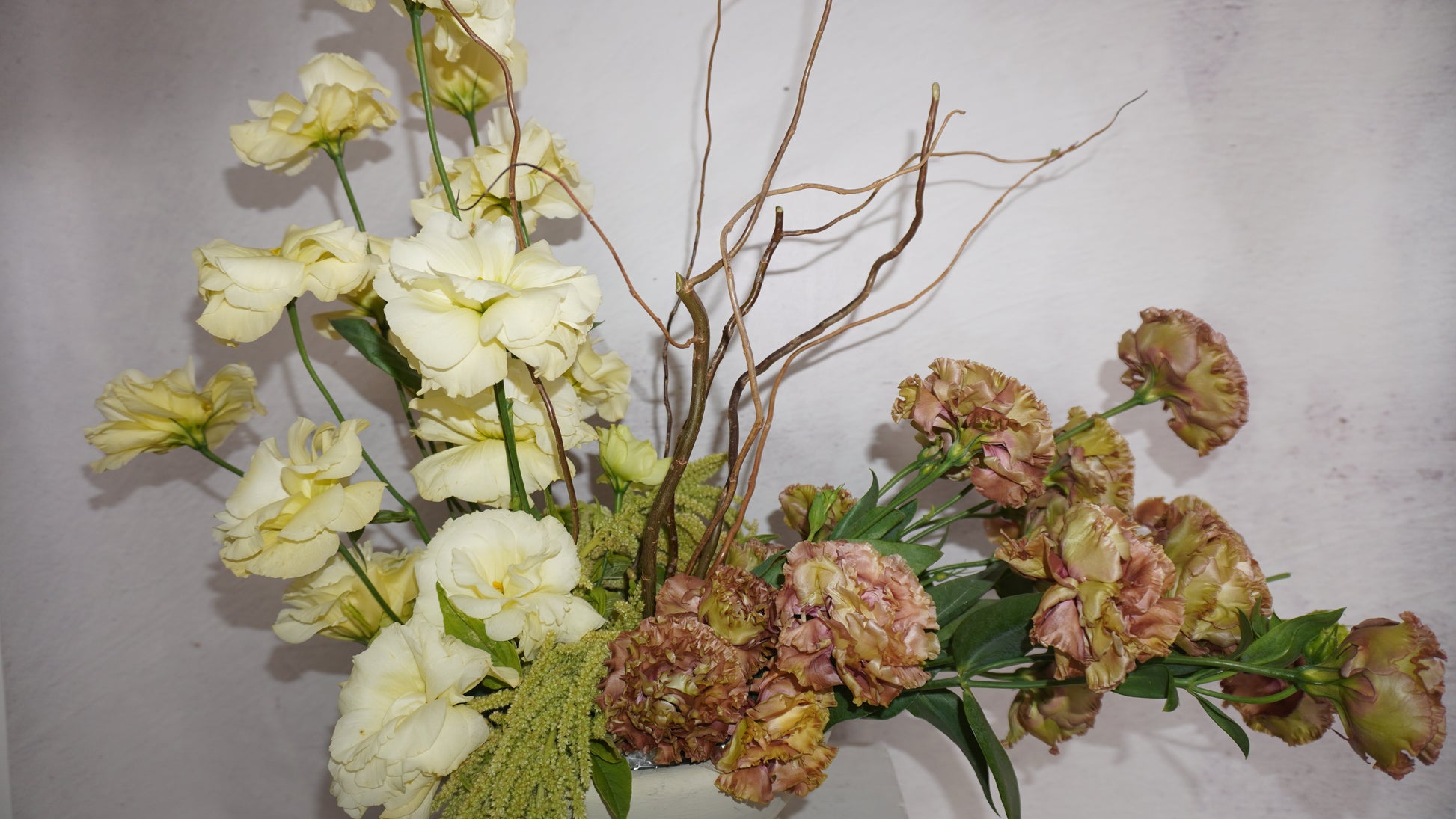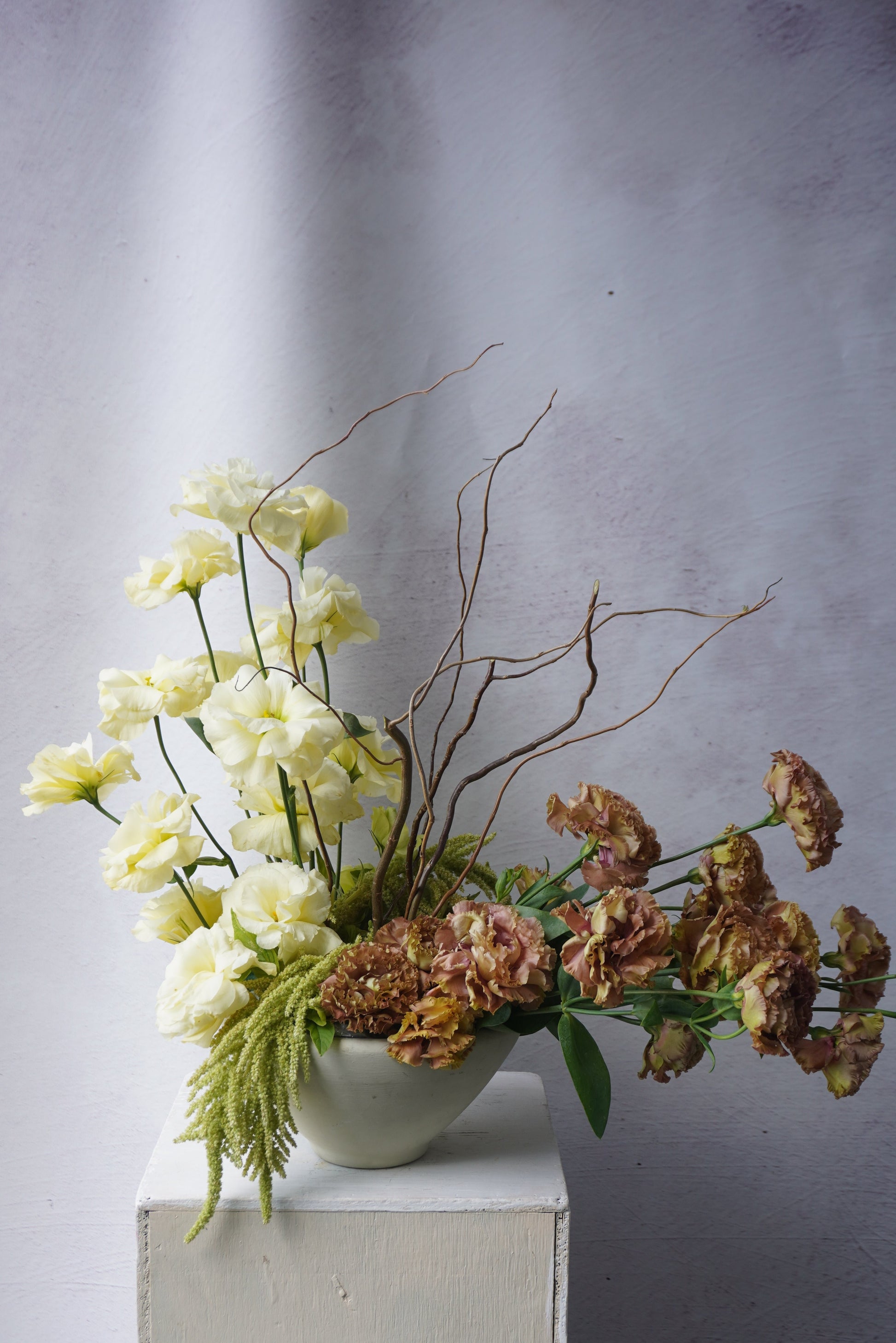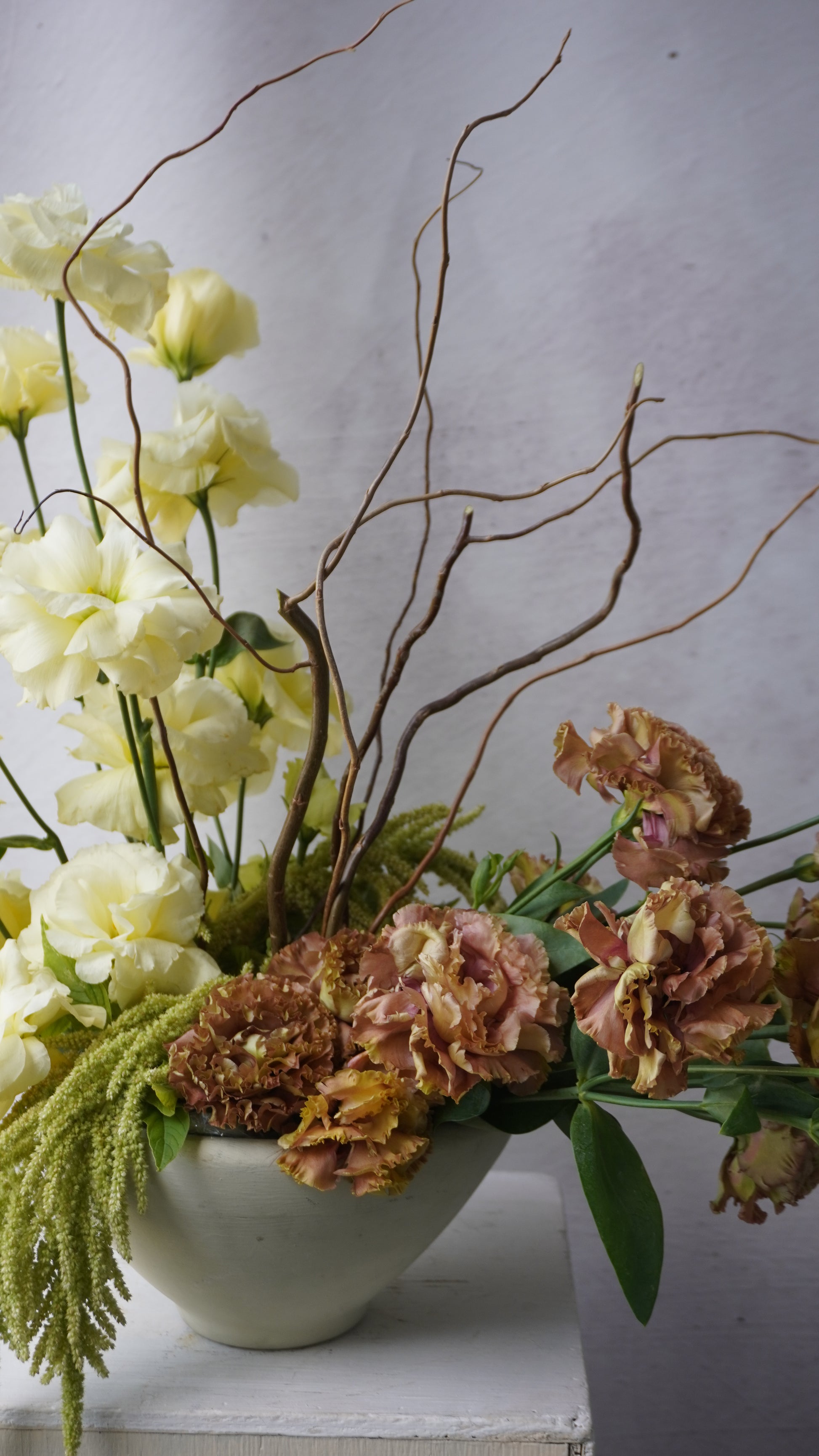 Arreglo con lisianthus crema, lisianthus chocolate, curly y amaranto sobre base de cerámica.