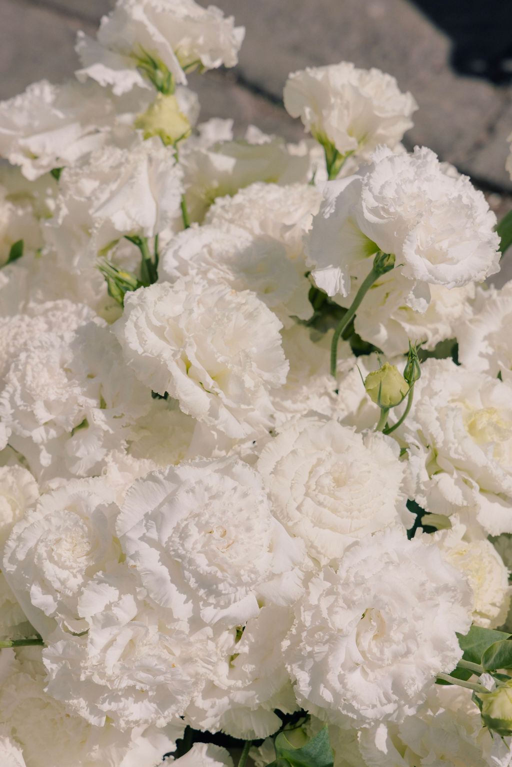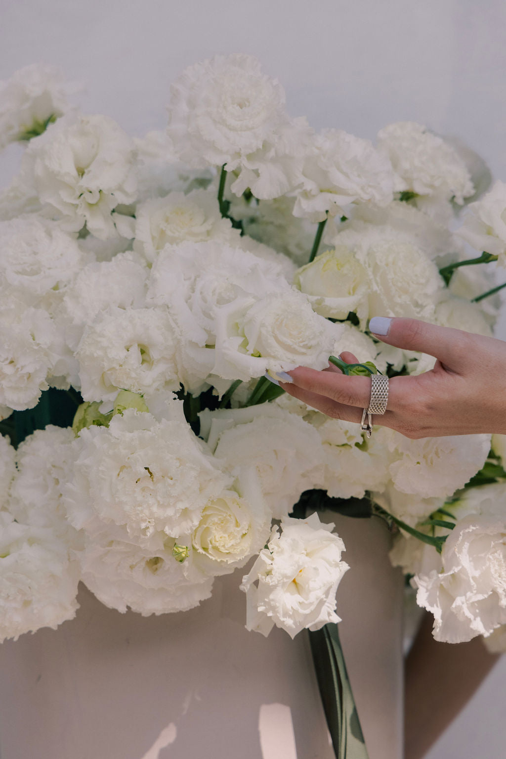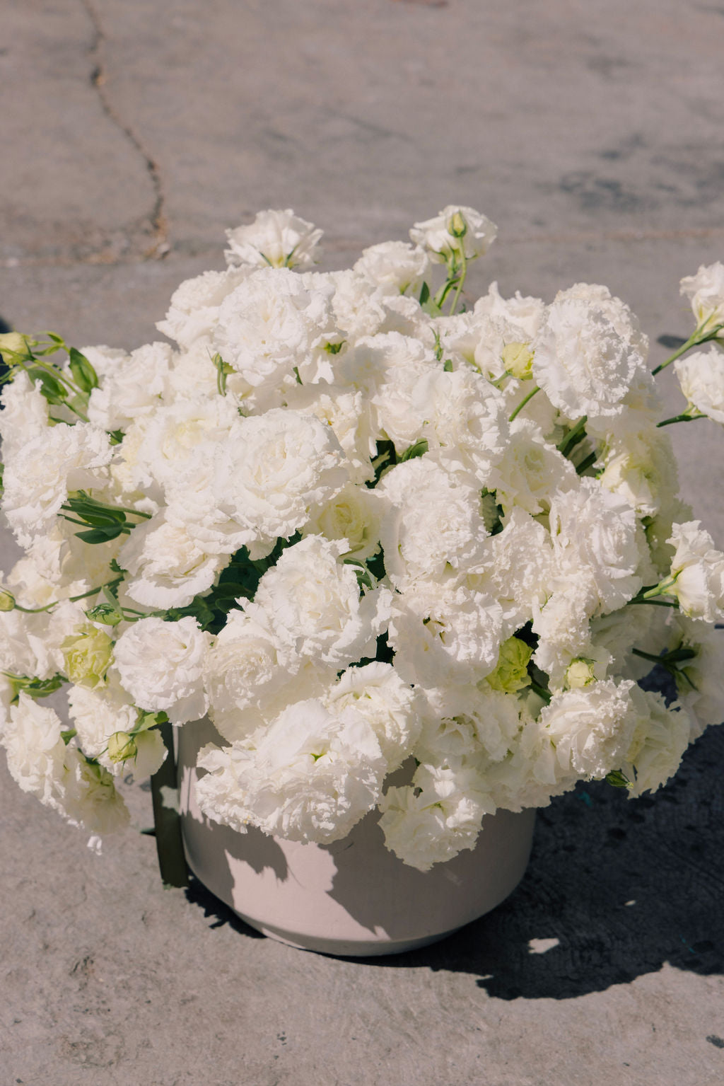 Arreglo con lisianthus sobre base de barro pintada en beige.