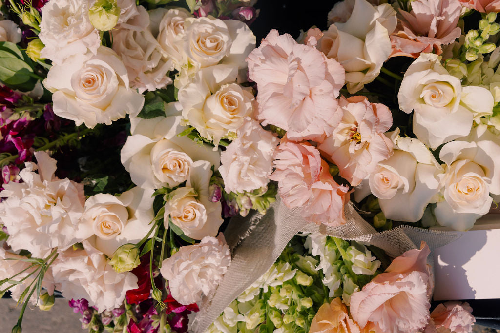 Boquet con lisianthus, rosas y perrito.