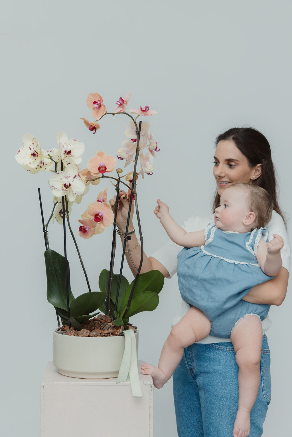 Cuatro varas de orquídeas combinadas sobre base de cerámica.