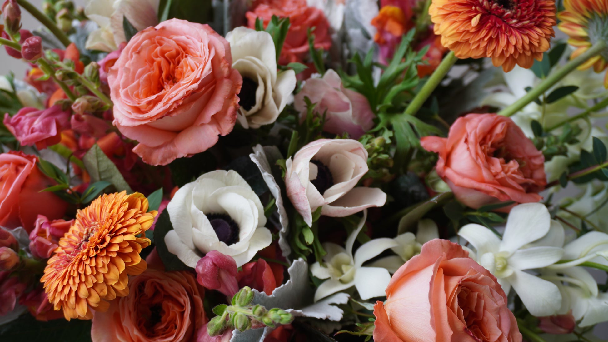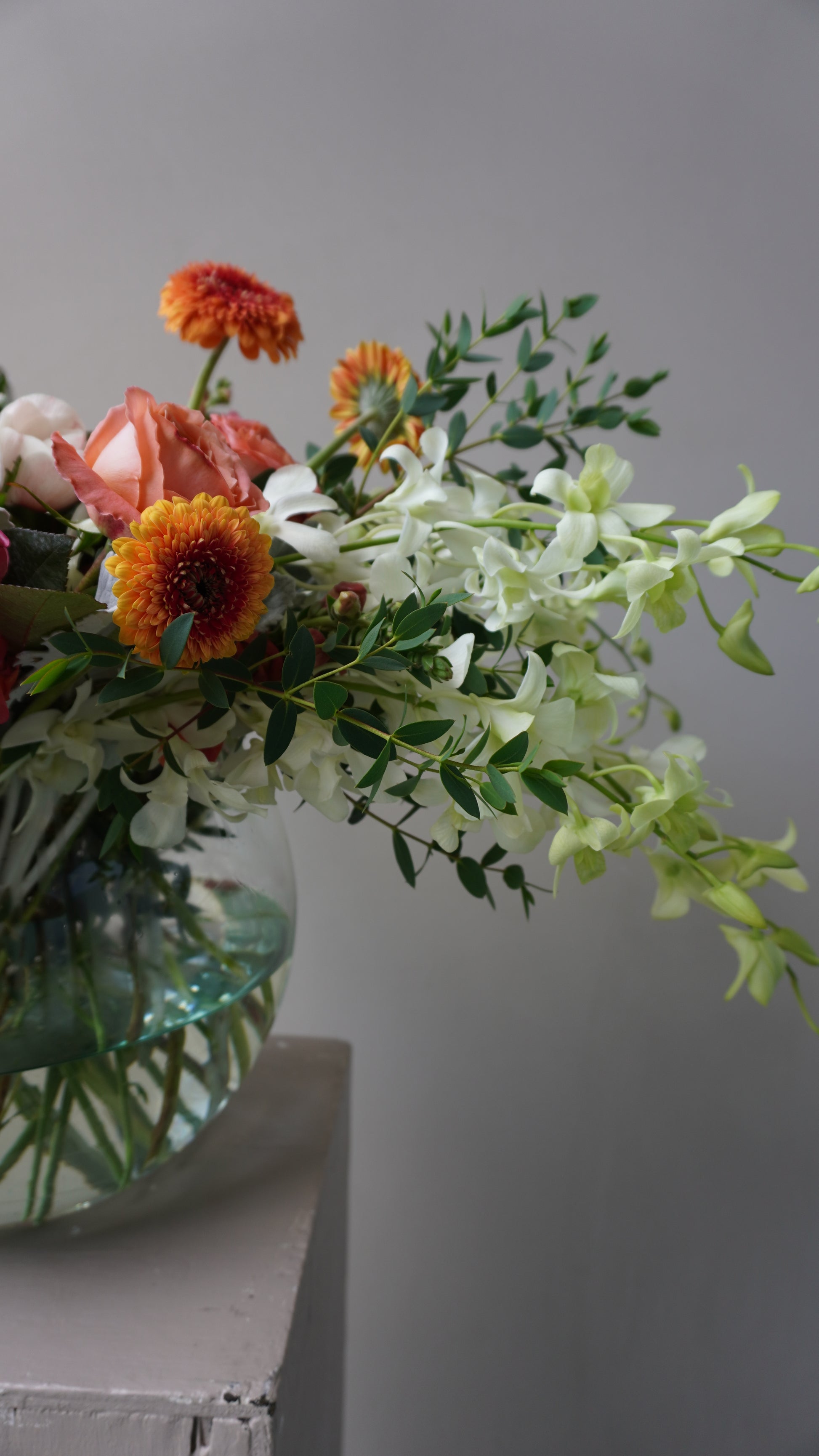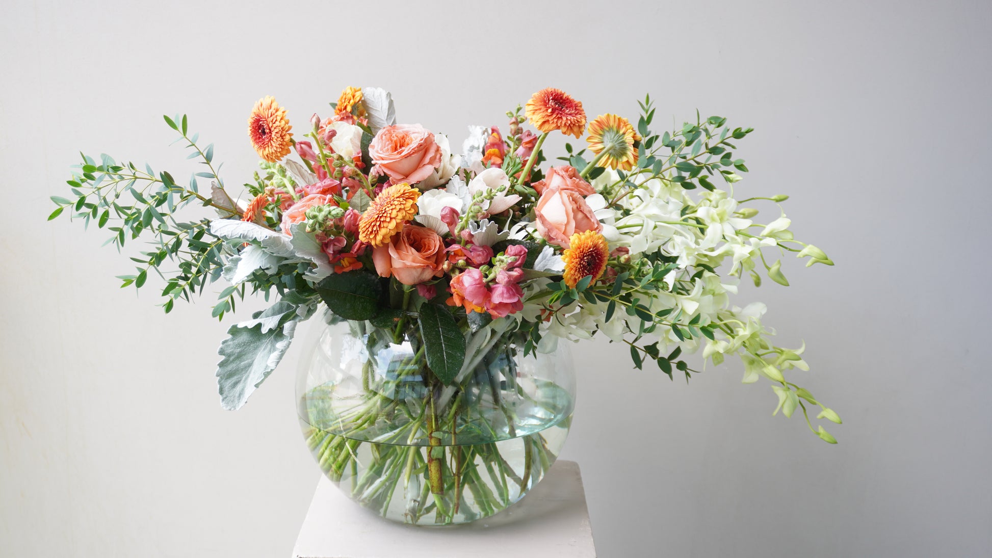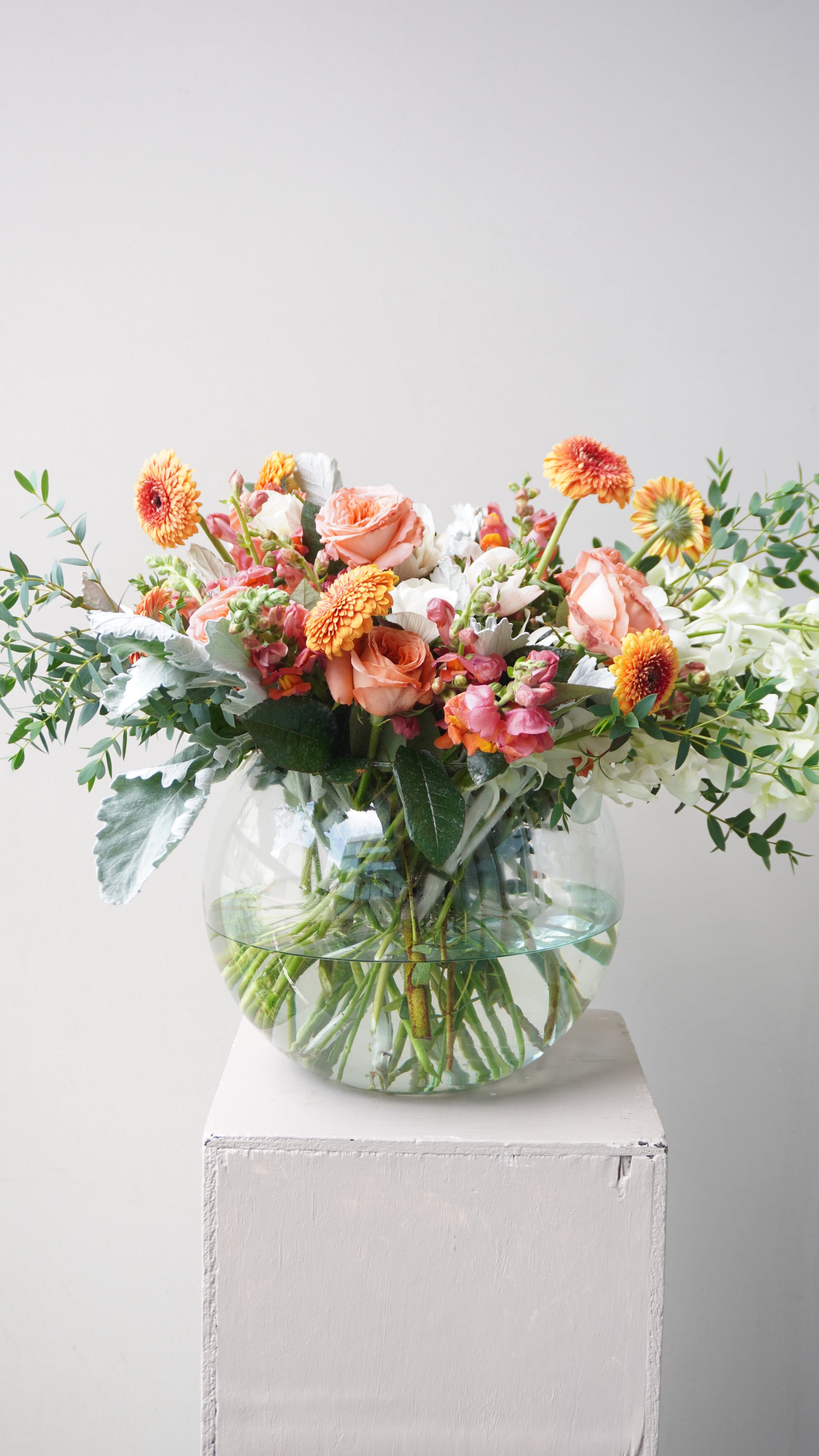 Pecera con perritos, anémonas, mini gerberas, rosas inglesas y orquídeas (opcional).