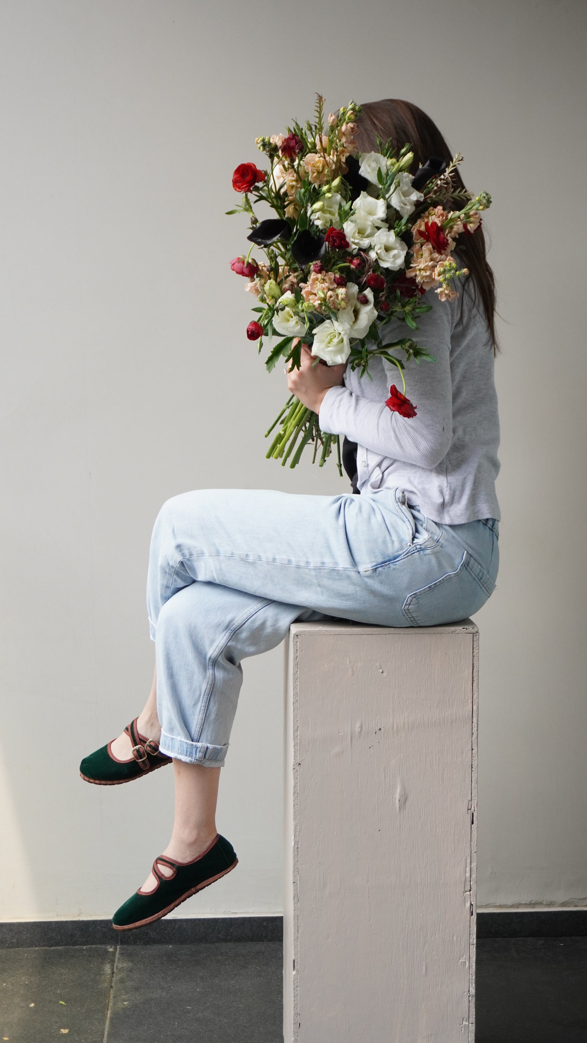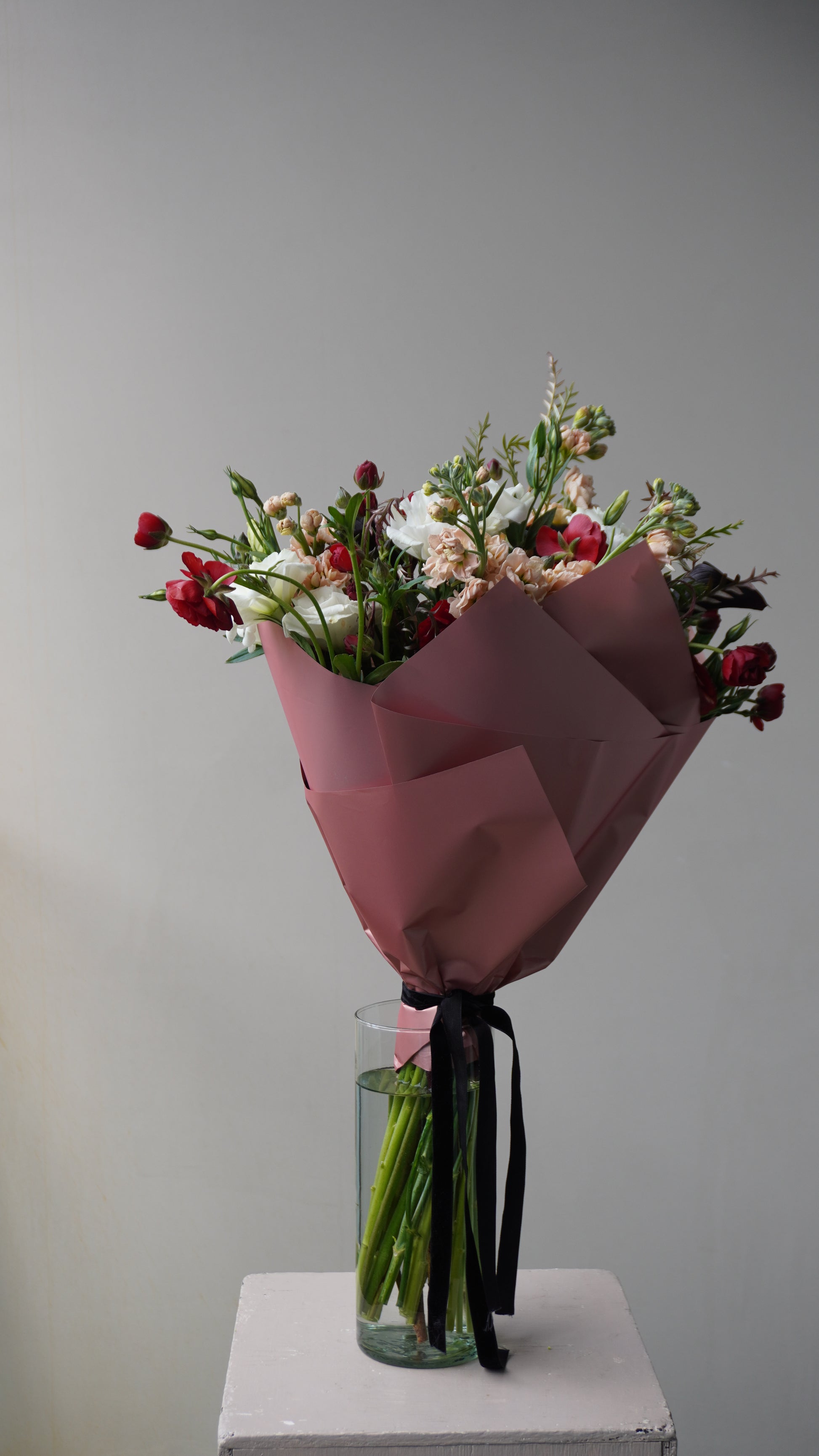 Ramo con rananculus, calalilis, matiola y lisianthus.