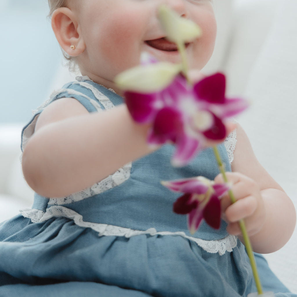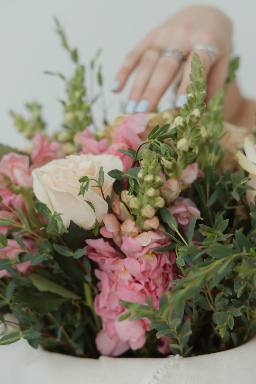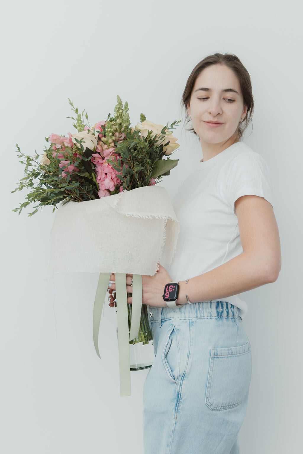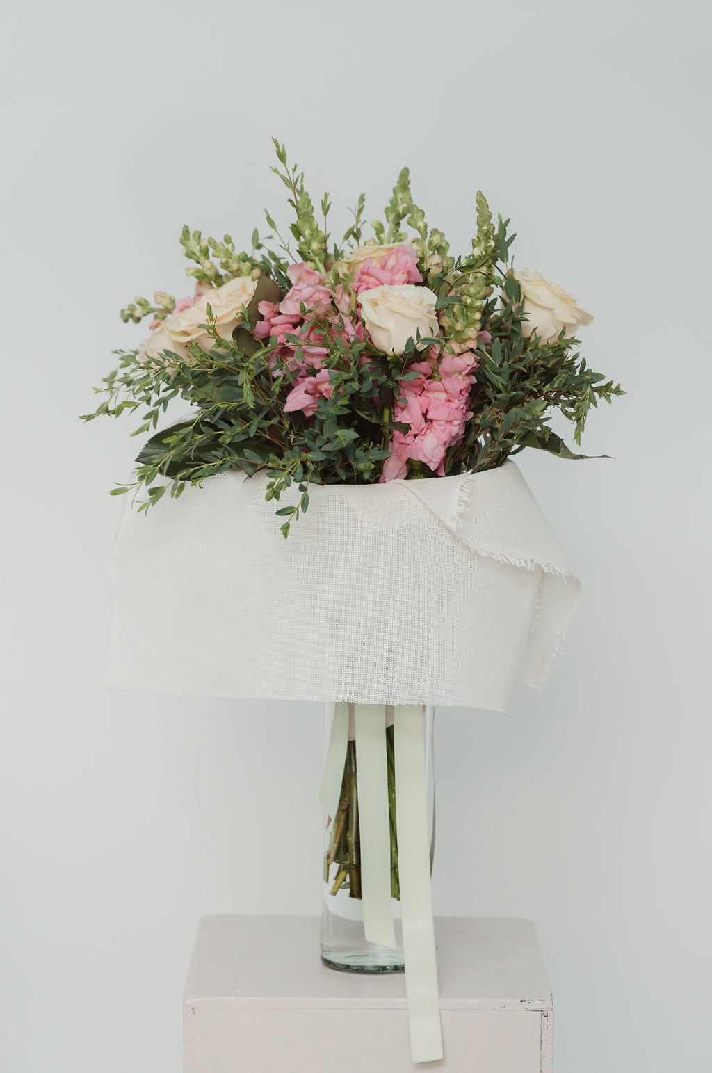 Ramo con rosas inglesas y perritos envuelto en yute + florero de vidrio.