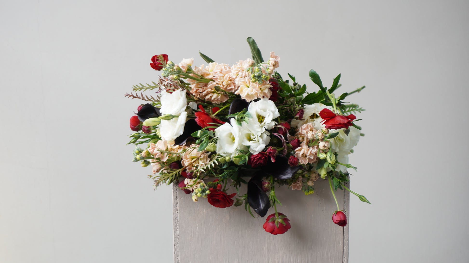 Ramo con Rananculus mariposa, lisianthus, mathiola y calalilis.